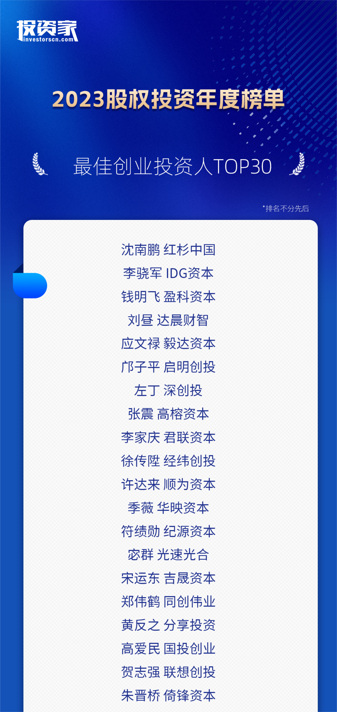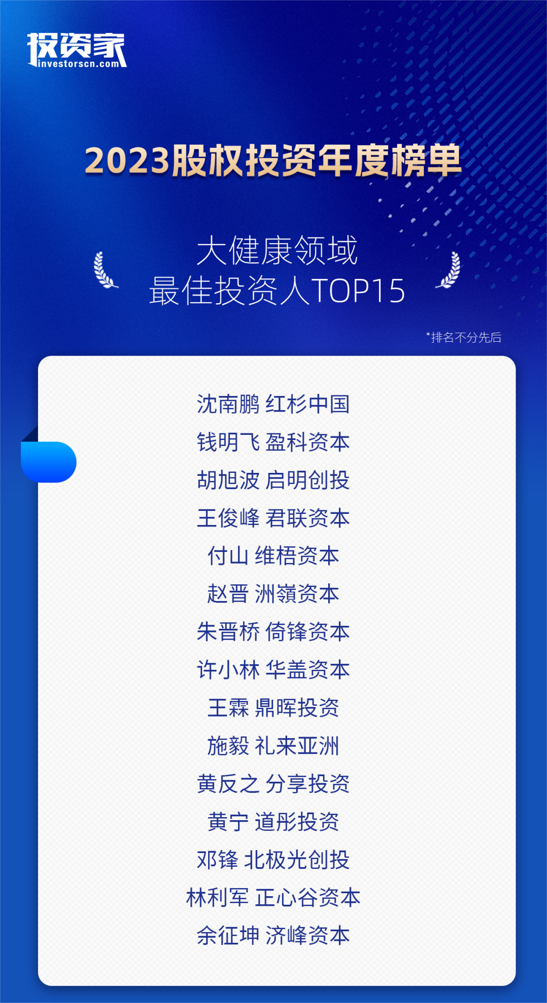 1月10日,投资家网旗下投资家研究院发布“投资家网·2023股权投资年度榜单”,通过问卷调研、数据核查等流程,历时数月评选出符合标准的投资机构/投资人上榜。凭借出众的投资及管理业绩,盈科资本董事长钱明飞荣膺“2023年度最佳创业投资人”“2023年度大健康领域最佳投资人”两项大奖。